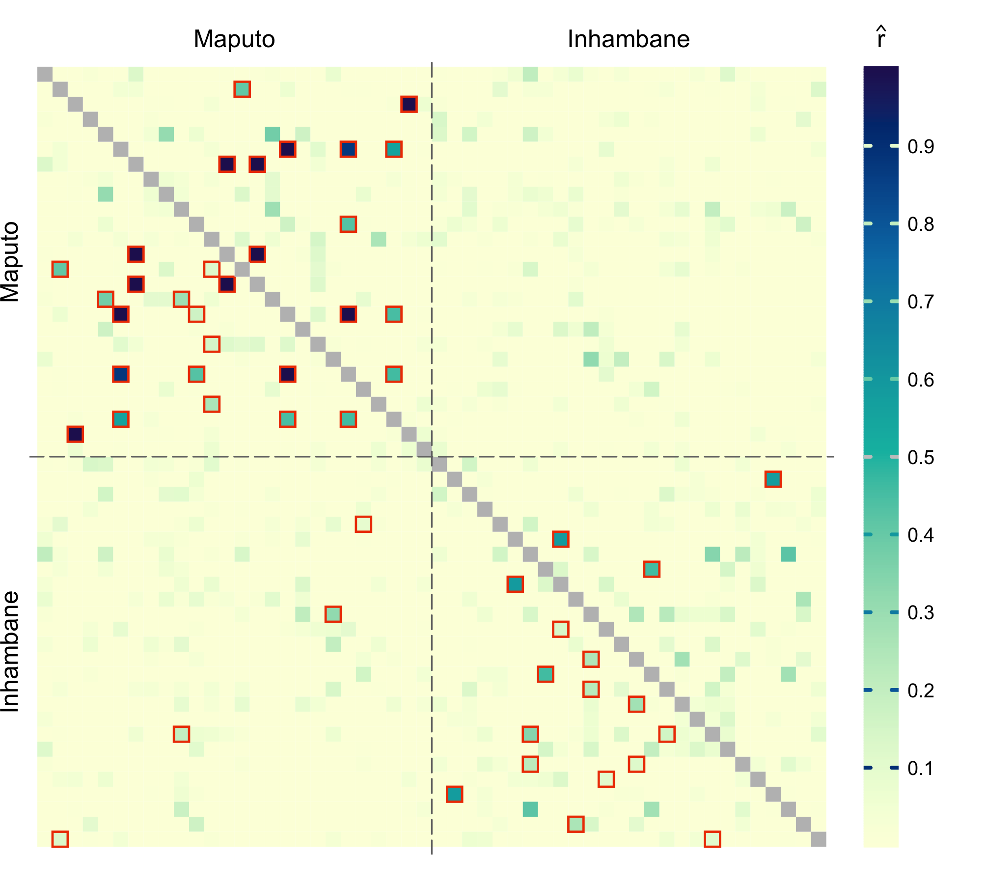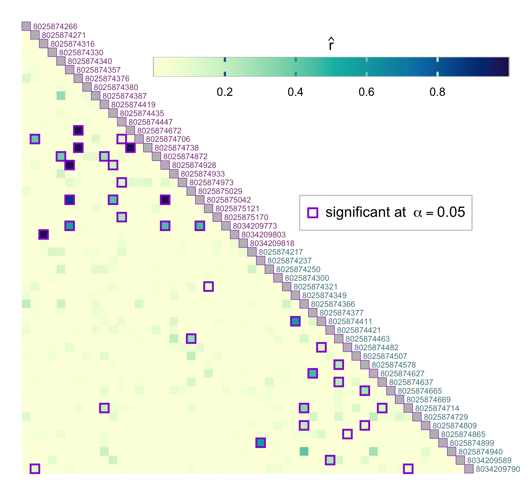 par(pardef)For reference, add a colorbar legend to the plot. It can be placed beside the main plot. For the upper matrix, we outline the pairs for which relatedness is significantly higher than (at the same significance level ):